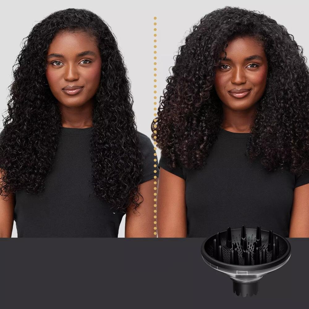 Použitím difúzera sa kučery nadvihnú už od korienkov, čím účes získa prirodzený objem bez zbytočného nafúknutého efektu. Difúzer na kučeravé vlasy podporuje tvar vĺn a lokní, zvýrazňuje ich štruktúru a pomáha dosiahnuť jednotný výsledok po celej hlave. Vlasy pôsobia plnšie, ľahšie a zároveň upravene.