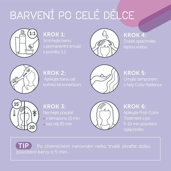 Ošetrenie vlasov - Po aplikácii permanentnej farby Londa Professional: Z vlasov vypláchnite farbu. Naneste Šampón Color Radiance a 1x vlasy umyte. Na zneutralizovanie a ustálenie farebných pigmentov naneste na 5 min ošetrenie Color Radiance Post Color Treatment.