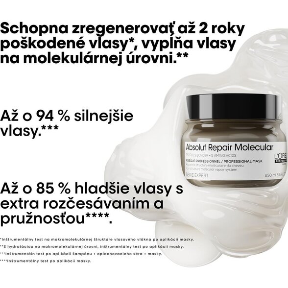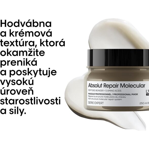 Novinka na regeneráciu veľmi poškodených vlasov** - Objavte silu radu Absolut Repair Molecular v koncentrovanej maske. Vďaka zloženiu s Peptides bonder a 5 aminokyselinami navracia maska objem do molekulárnych vrstiev vlasov, dodáva až o 94 % viac sily*** a až o 85 % viac hebkosti pre pružné, hydratované vlasy****.