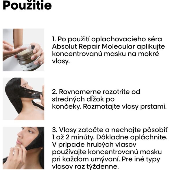 - Po použití oplachovacieho séra aplikujte koncentrovanú masku na mokré vlasy.