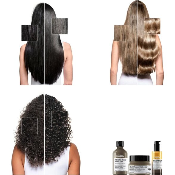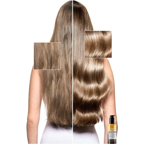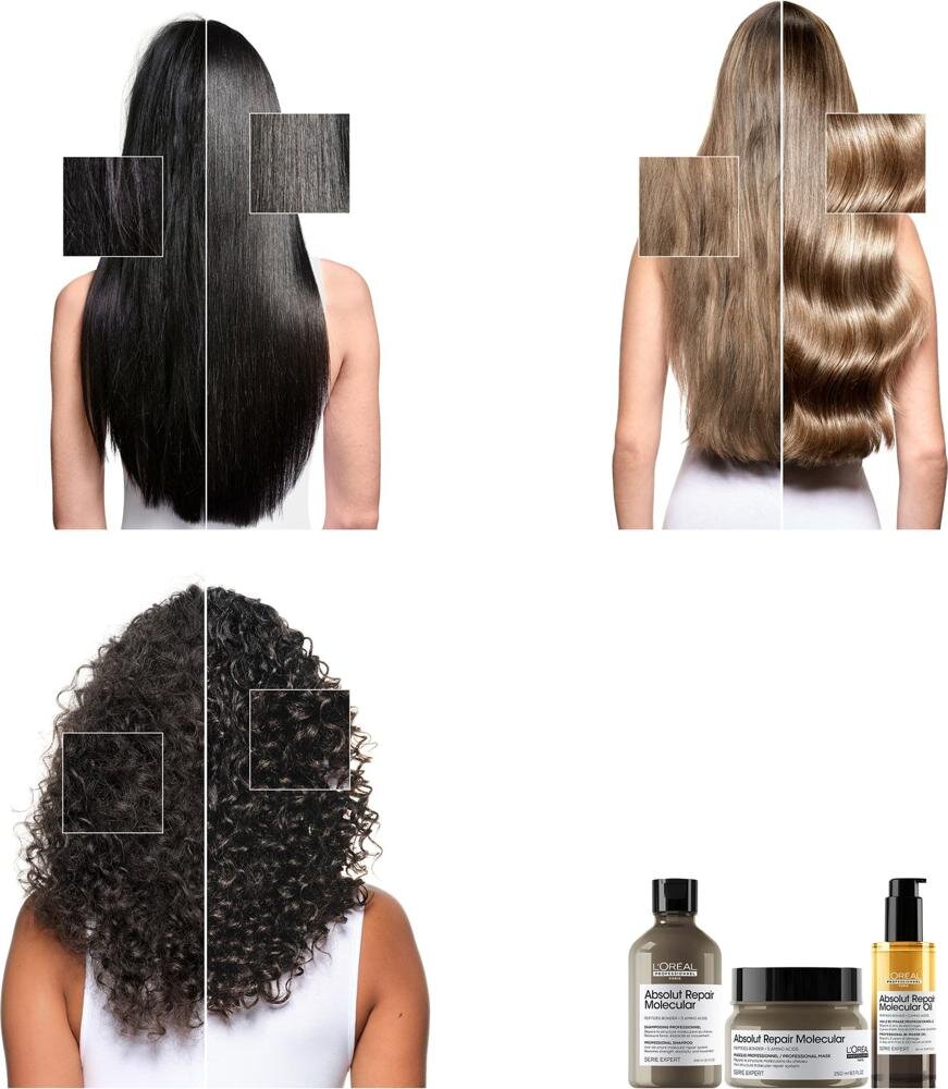 L'Oréal olej na vlasy Absolut Repair Molecular je určený pre zosvetľované a melírované vlasy, chemicky narovnávané alebo trvalo ondulované vlasy, vlasy poškodené žehlením a kulmovaním, suché, krehké a lámavé vlasy bez vitality a pre profesionálne salóny aj náročných domácich používateľov.