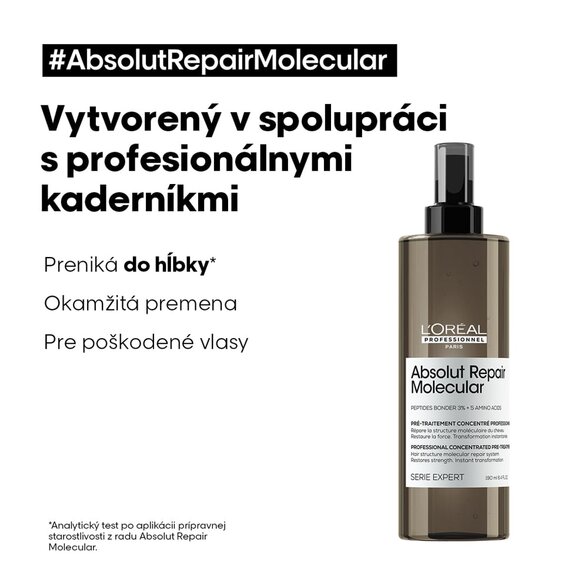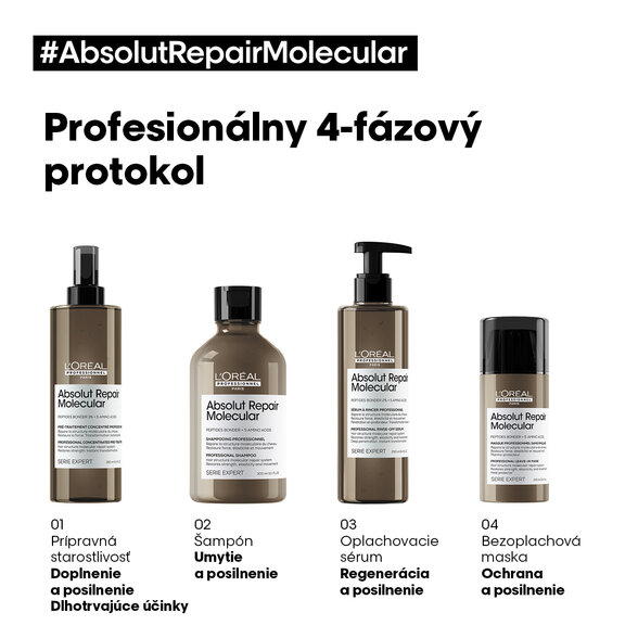 - Po preniknutí do vnútra vlasového vlákna sú schopné znovu postaviť a obnoviť molekulárnu štruktúru vlasu**. S Absolut Repair Molecular dokážete zregenerovať značne poškodené vlasy jedným použitím a navrátiť vlasom pôvodnú silu a pružnosť***.