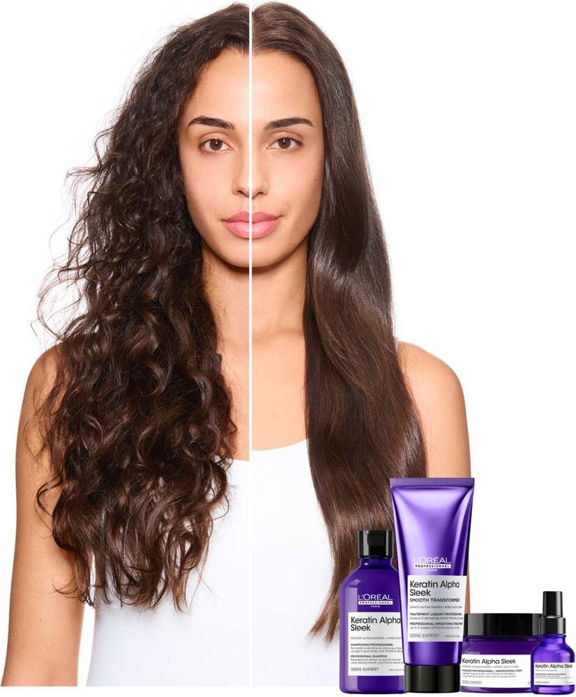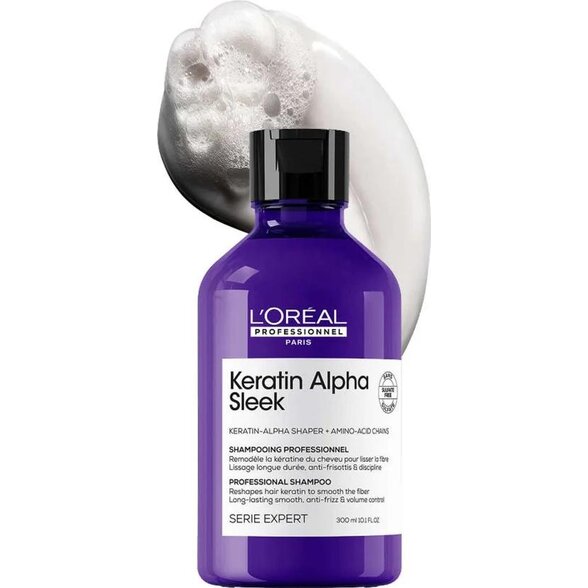 L'Oréal Professionnel Keratin Alpha Sleek uhladzujúci šampón na krepovité vlasy je profesionálny vlasový šampón vyvinutý špeciálne pre vlasy, ktoré majú sklon ku krepovateniu, nadmernému objemu a nepoddajnej textúre. Ide o moderný šampón na uhladenie vlasov, ktorý pomáha obnoviť kontrolu nad vlasovým vláknom už počas samotného umývania. Vlasy sú po použití hladšie, disciplinovanejšie a pripravené na jednoduchší styling bez nadmerného krepovatenia.