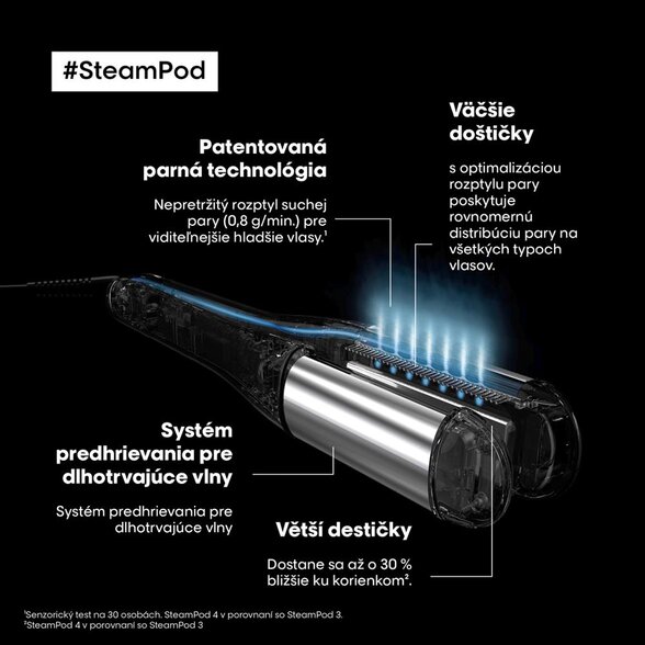 Najnovšia generácia, SteamPod 4, je našou prvou multifunkčnou profesionálnou parnou žehličkou. Vďaka sile pary a novým technickým špecifikáciám, budete schopní narovnať, zvlniť alebo natočiť akýkoľvek typ vlasov až 3-krát rýchlejšie¹ a s až o 95 % nižšou lámavosťou vlasov². Navrhnutá s ohľadom na životné prostredie. Balenie SteamPod 4 je ľahšie, neobsahuje plasty a jeho súčasťou je ochranné puzdro vyrobené v spolupráci so solidárnymi projektmi. Nízky počet reklamácií tiež dokazuje udržateľnosť odolnej konštrukcie žehličky SteamPod.