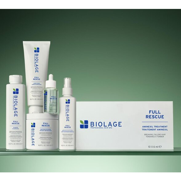 Biolage Full Rescue je komplexná starostlivosť o vlasy navrhnutá špeciálne na riešenie problému, ktorý trápi množstvo žien aj mužov – nadmerné vypadávanie vlasov. Táto inovatívna vlasová kozmetika je výsledkom spojenia vedy a prírody. Vďaka aktívnym látkam ako niacínamid (vitamín B3) a rozmarínový olej pomáha obnovovať zdravie vlasovej pokožky, posilňuje vlasové vlákna, a podporuje rýchlejší rast vlasov.