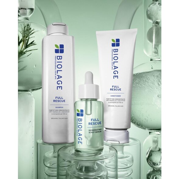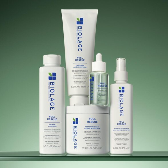 Biolage Full Rescue je komplexná starostlivosť o vlasy navrhnutá špeciálne na riešenie problému, ktorý trápi množstvo žien aj mužov – nadmerné vypadávanie vlasov. Táto inovatívna vlasová kozmetika je výsledkom spojenia vedy a prírody. Vďaka aktívnym látkam ako niacínamid (vitamín B3) a rozmarínový olej pomáha obnovovať zdravie vlasovej pokožky, posilňuje vlasové vlákna, a podporuje rýchlejší rast vlasov.