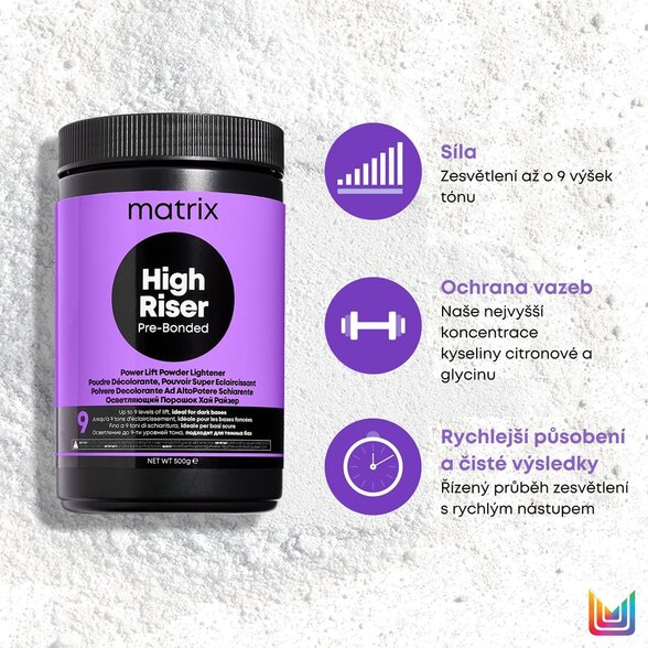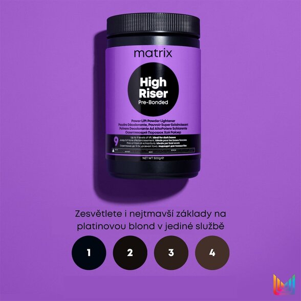 S novým zosvetľovačom High Riser vytvoríte najčistejšiu platinovú blond a zosvetlíte najtmavšie základy so zníženým rizikom poškodenia. Vďaka účinku samotného prášku nie je potrebné používať najsilnejšie oxidanty.