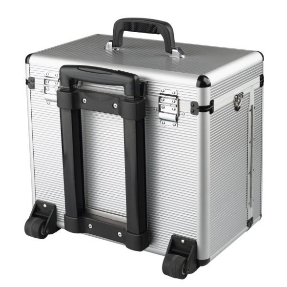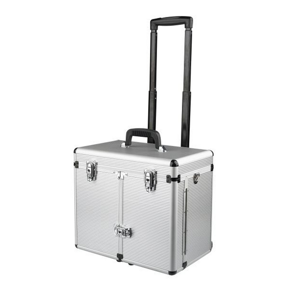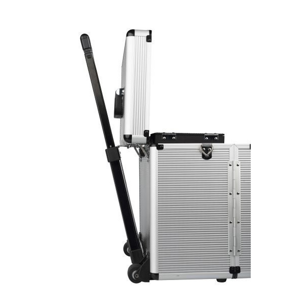 Hliníkový kufrík na koliečkach. Inteligentná rukoväť sa pohybuje s krytom keď je vozík otvorený. Vnú...