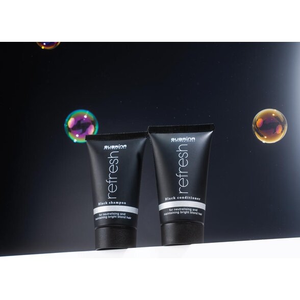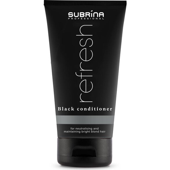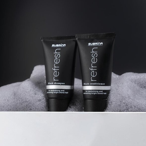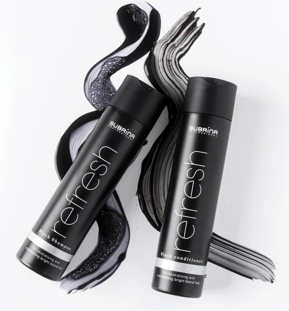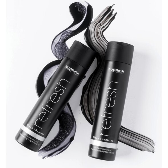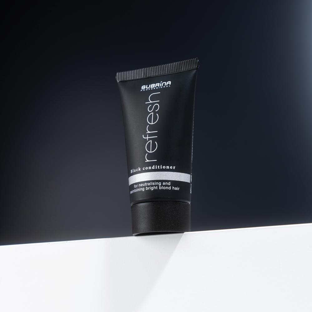 Dokonalý blond odtieň si zaslúži viac než len šampón. Preto značka Subrina Professional vytvorila jedinečný Refresh Black čierny kondicionér na blond vlasy, ktorý dopĺňa účinok tónovacieho šampónu a zároveň poskytuje intenzívnu výživu, hebkosť a lesk. Tento profesionálny kondicionér na blond a sivé vlasy je navrhnutý tak, aby udržiaval chladný, iskrivý tón a zároveň obnovoval pružnosť a zdravie zosvetlených alebo melírovaných vlasov.