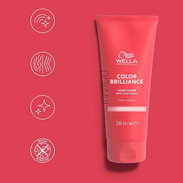 Doprajte svojim vlasom tú najlepšiu starostlivosť, akú si farbené vlasy zaslúžia. Kondicionér Wella Professionals Invigo Color Brilliance je špeciálne navrhnutý pre jemné a normálne vlasy, ktoré prešli farbením a potrebujú intenzívnu výživu, ochranu farby vlasov a zároveň nezaťaženú ľahkosť. Vďaka pokročilému zloženiu s limetkovým kaviárom, vitamínom E a technológiou Metal Purifier tento kondicionér zabezpečí, že vaša farba zostane žiarivá, dlhodobo intenzívna a vlasy budú hebké, lesklé a krásne uhladené.
